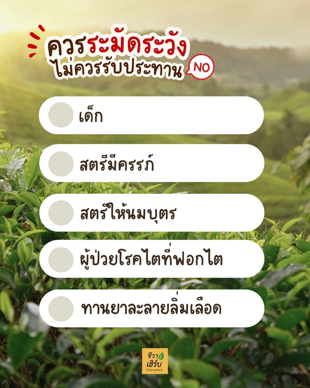 – ผู้ที่ไม่ดื่มกาแฟ หรืออยากได้ชาเพื่อสุขภาพ ไม่มีคาเฟอีน