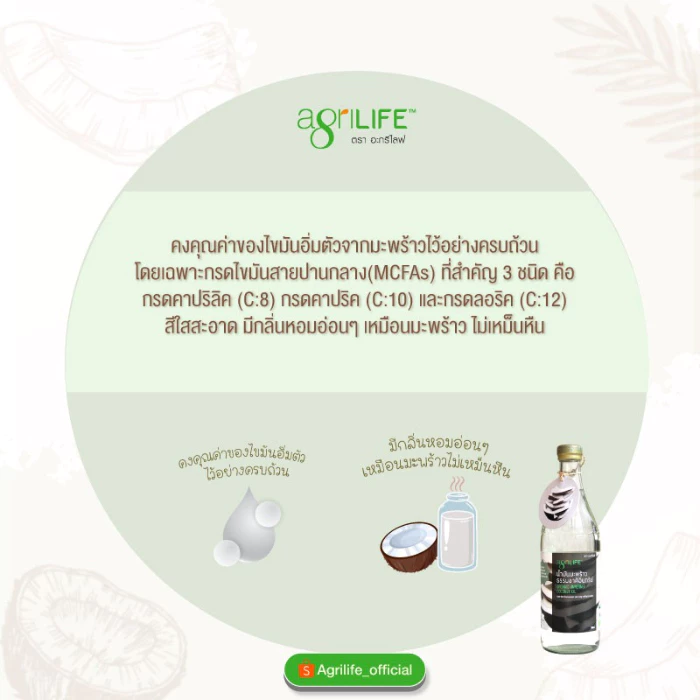 แนะนำมากที่สุดสำหรับการปรุงอาหารและการอบ” - แหล่งที่มาหลักของ MCFAs (กรดไขมันสายปานกลาง) รวมถึงกรดลอริก (C:12)